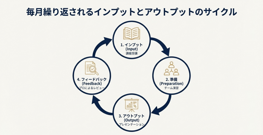 インプットからアウトプットの1ヶ月の間に事例演習の準備を行います。この構造こそが、知識をスキルとして定着させるBCNG独自の仕組みです。